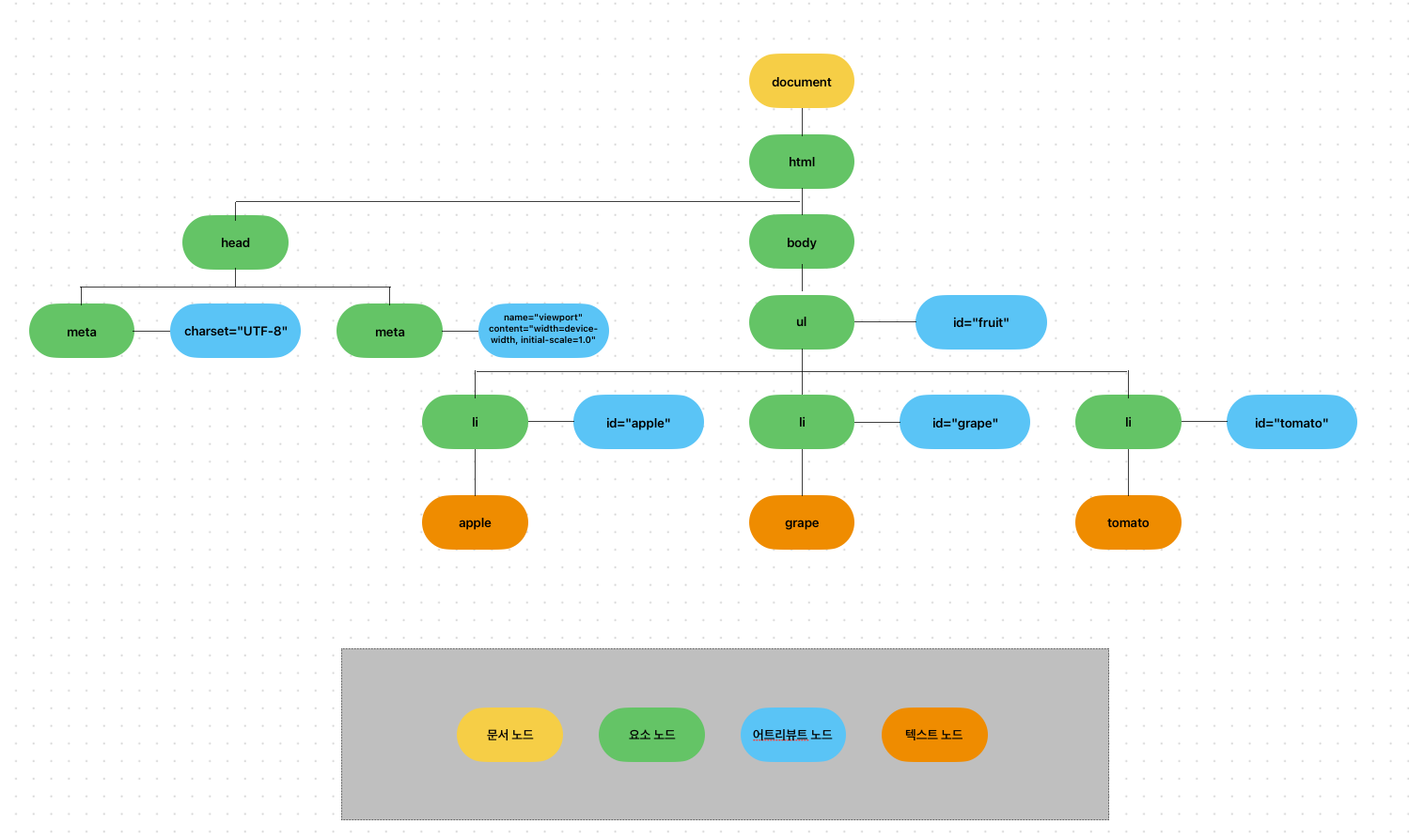🔘 문서 노드: DOM 트리의 최상위인 루트 노드로 document 객체를 가리킨다. 따라서 DOM 트리의 노드들에 접근하기 위해서는 문서 노드를 통해야 한다.